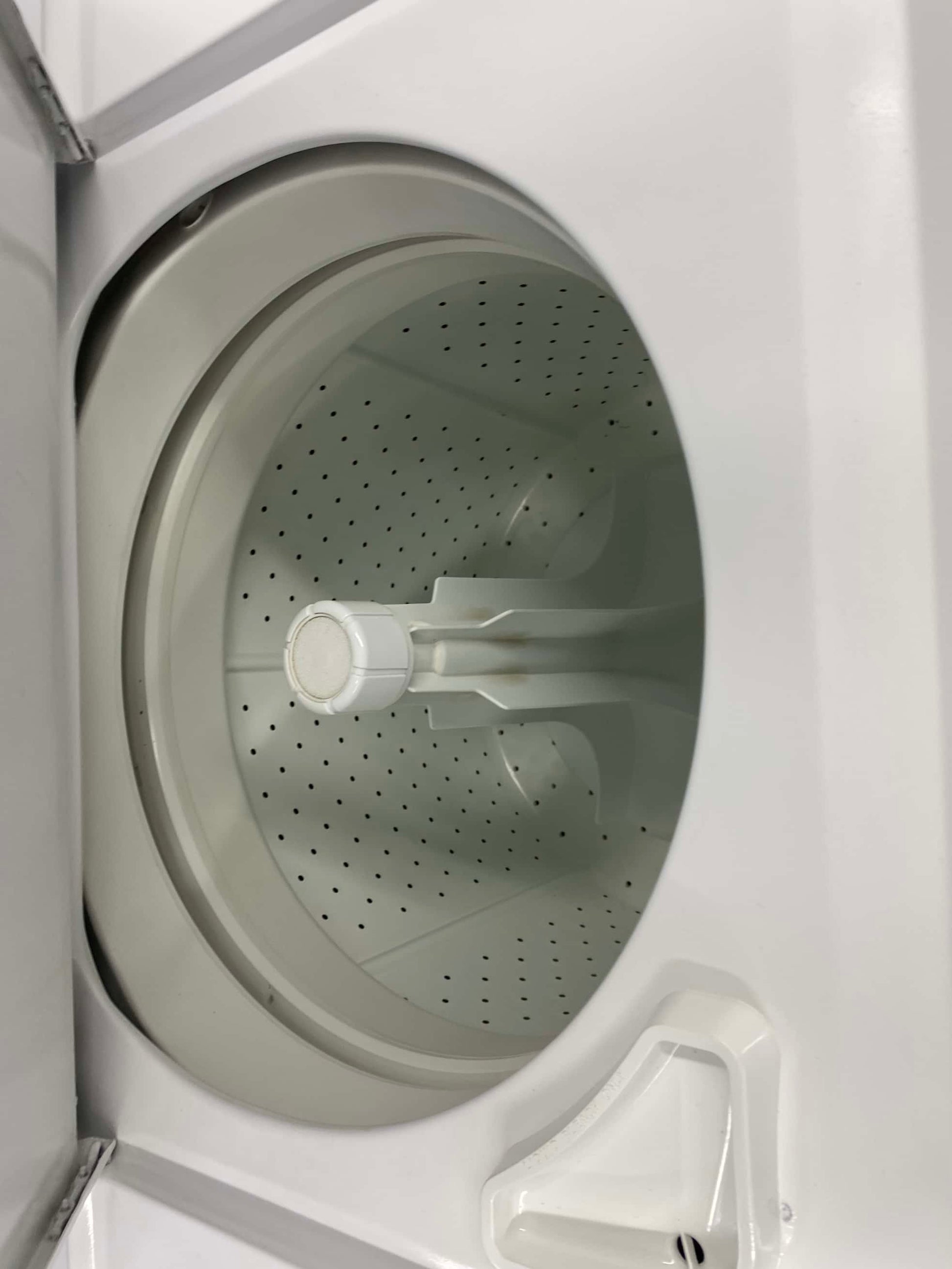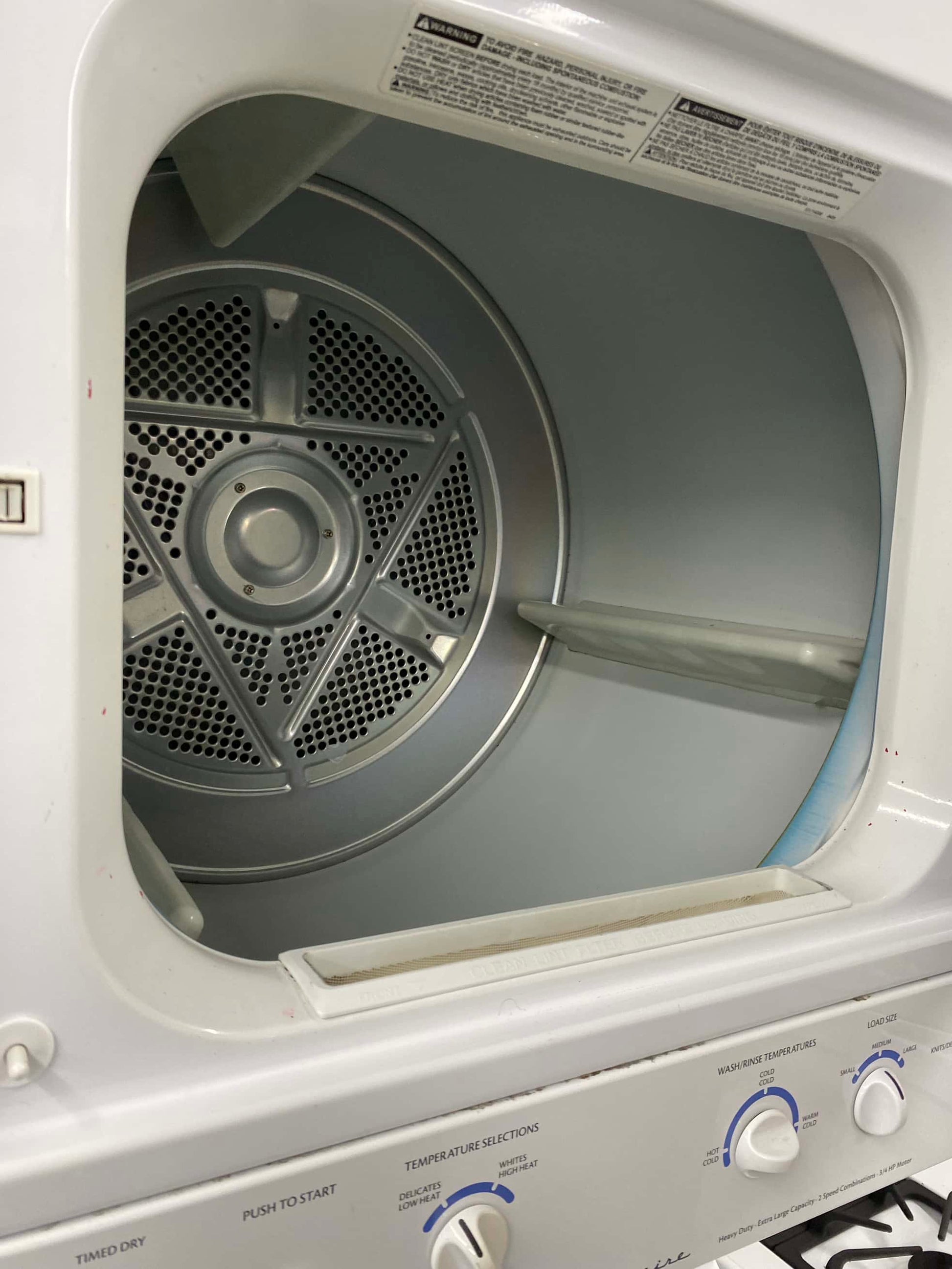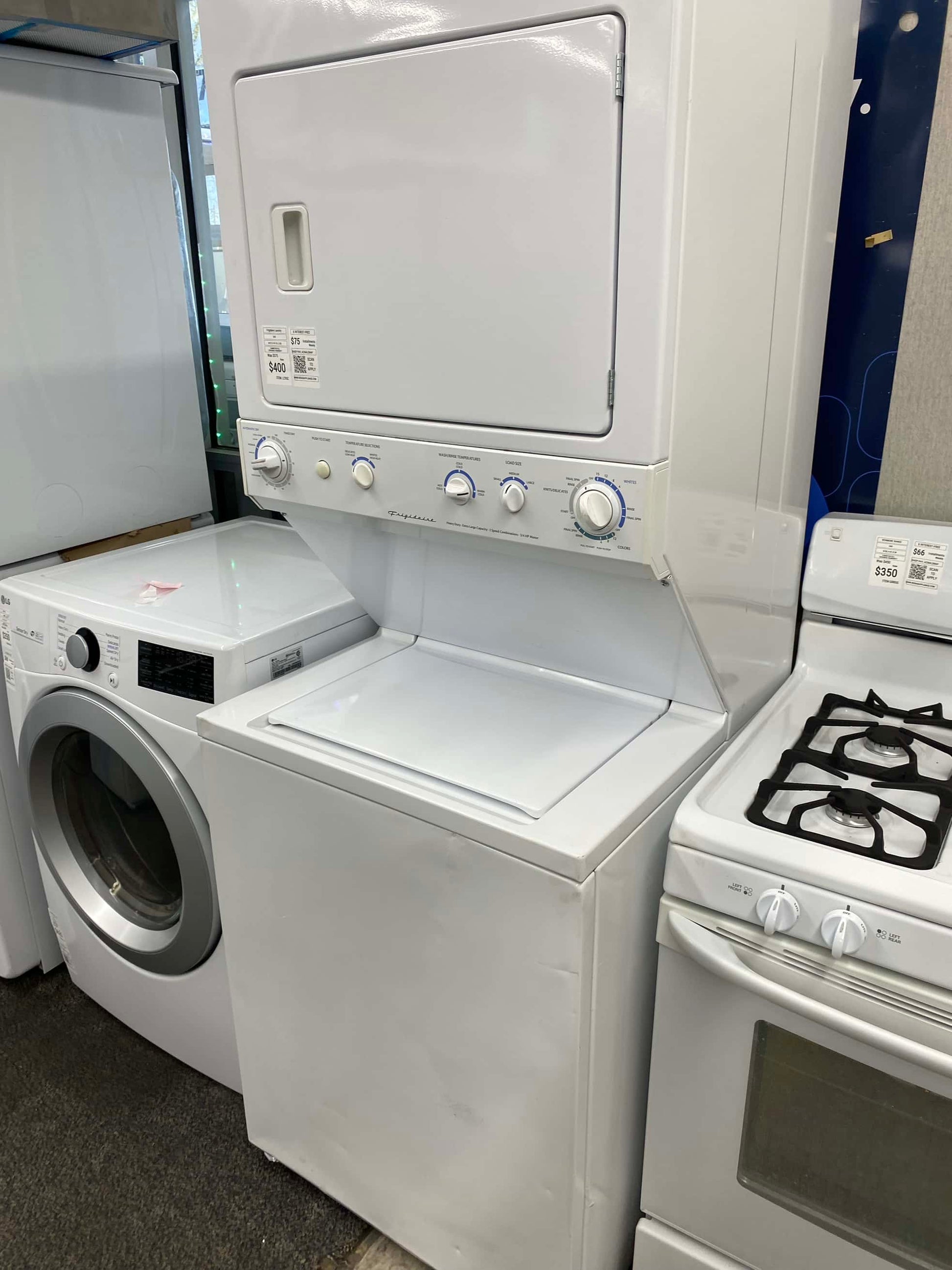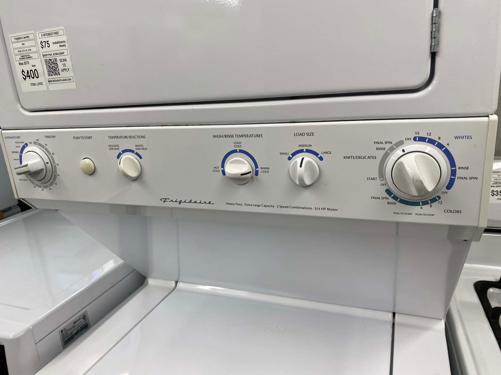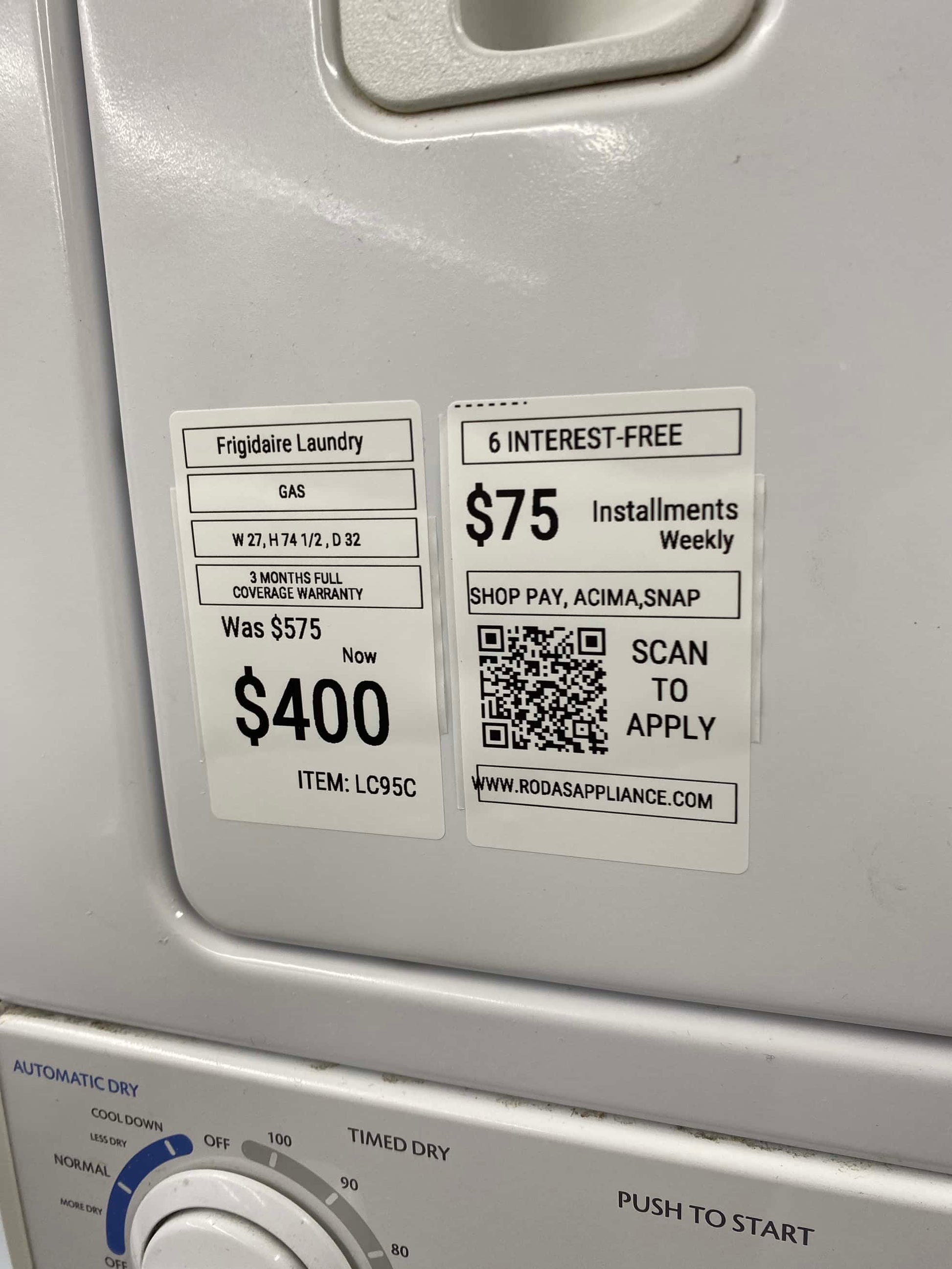 ^ Item: #LC95C Frigidaire laundry center washer and dryer set GAS stackable 27”