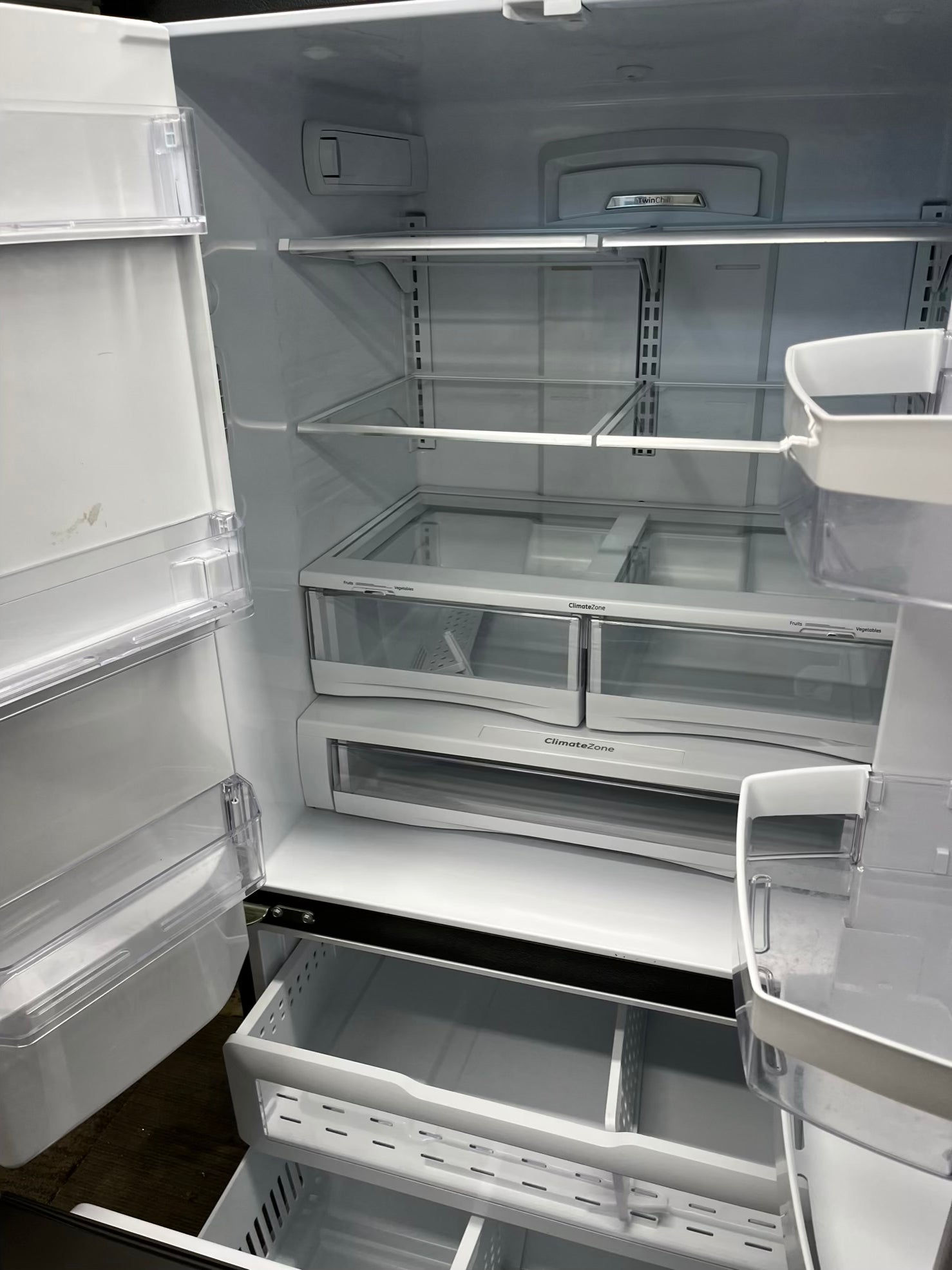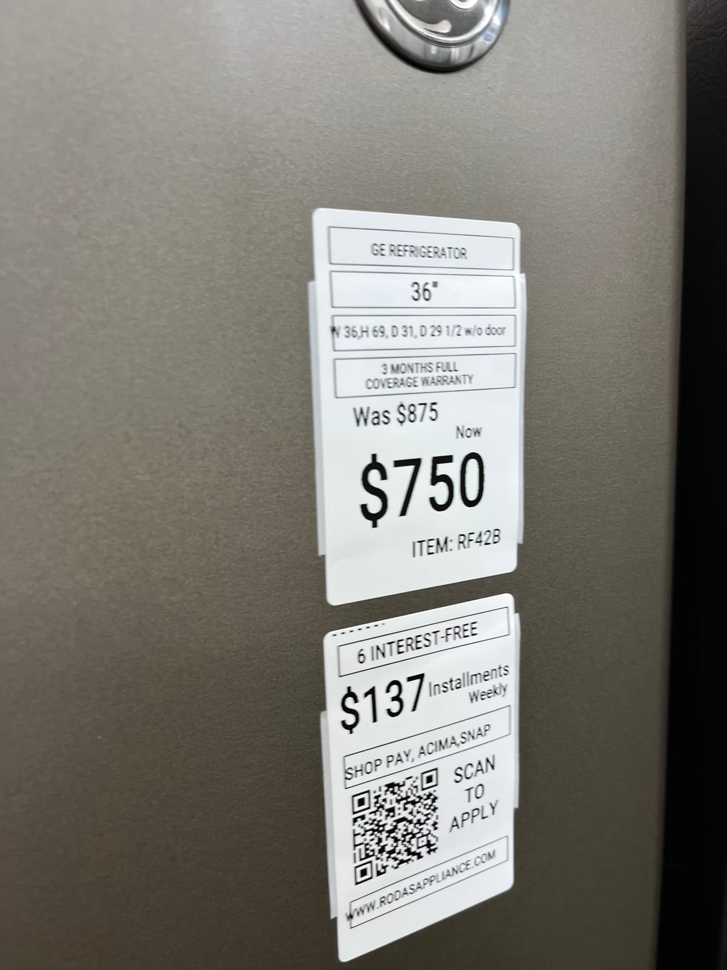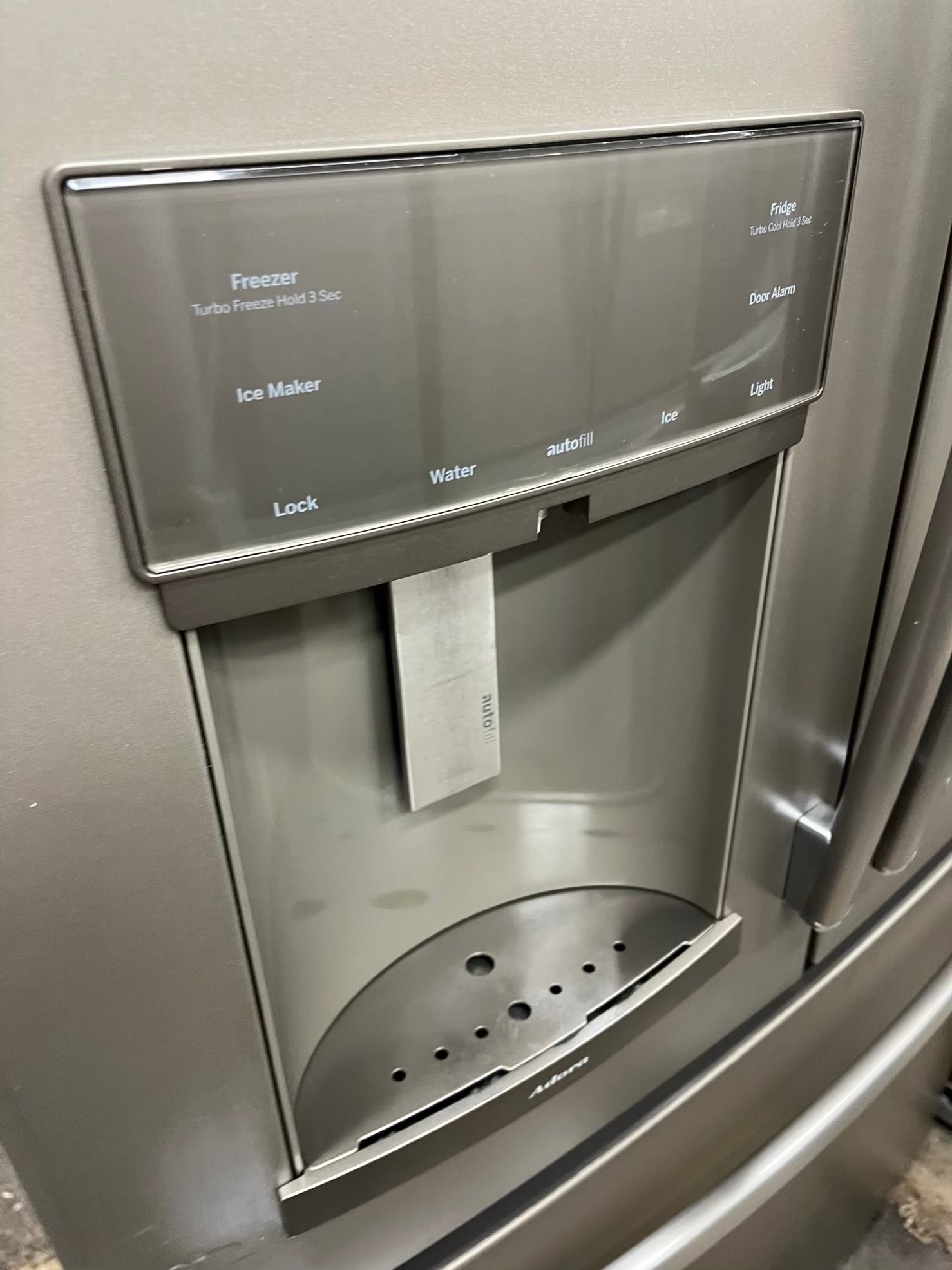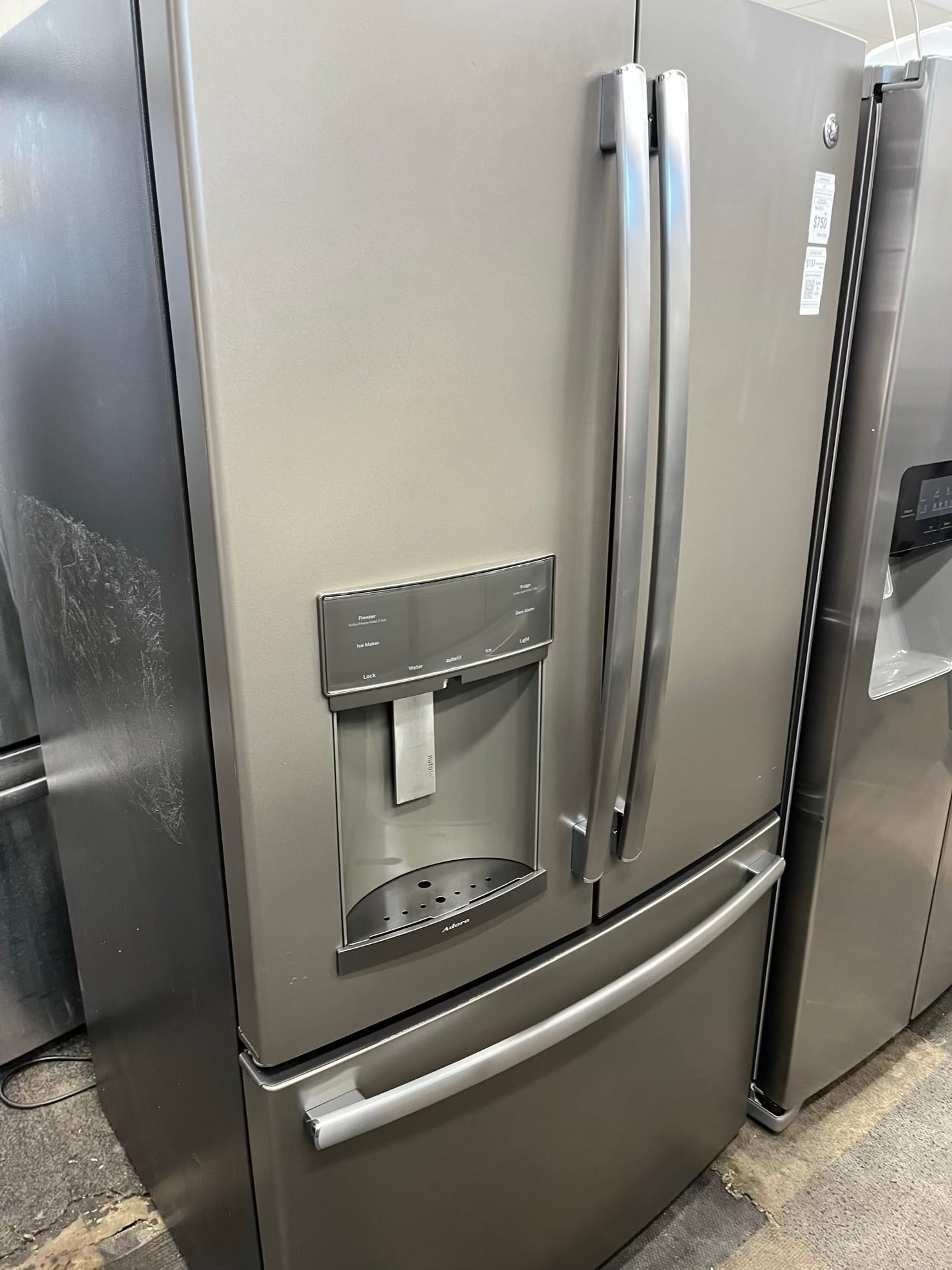 ^ Item: #RF42B GE french door refrigerator slate stainless steel w/ ice and water dispenser 36” in