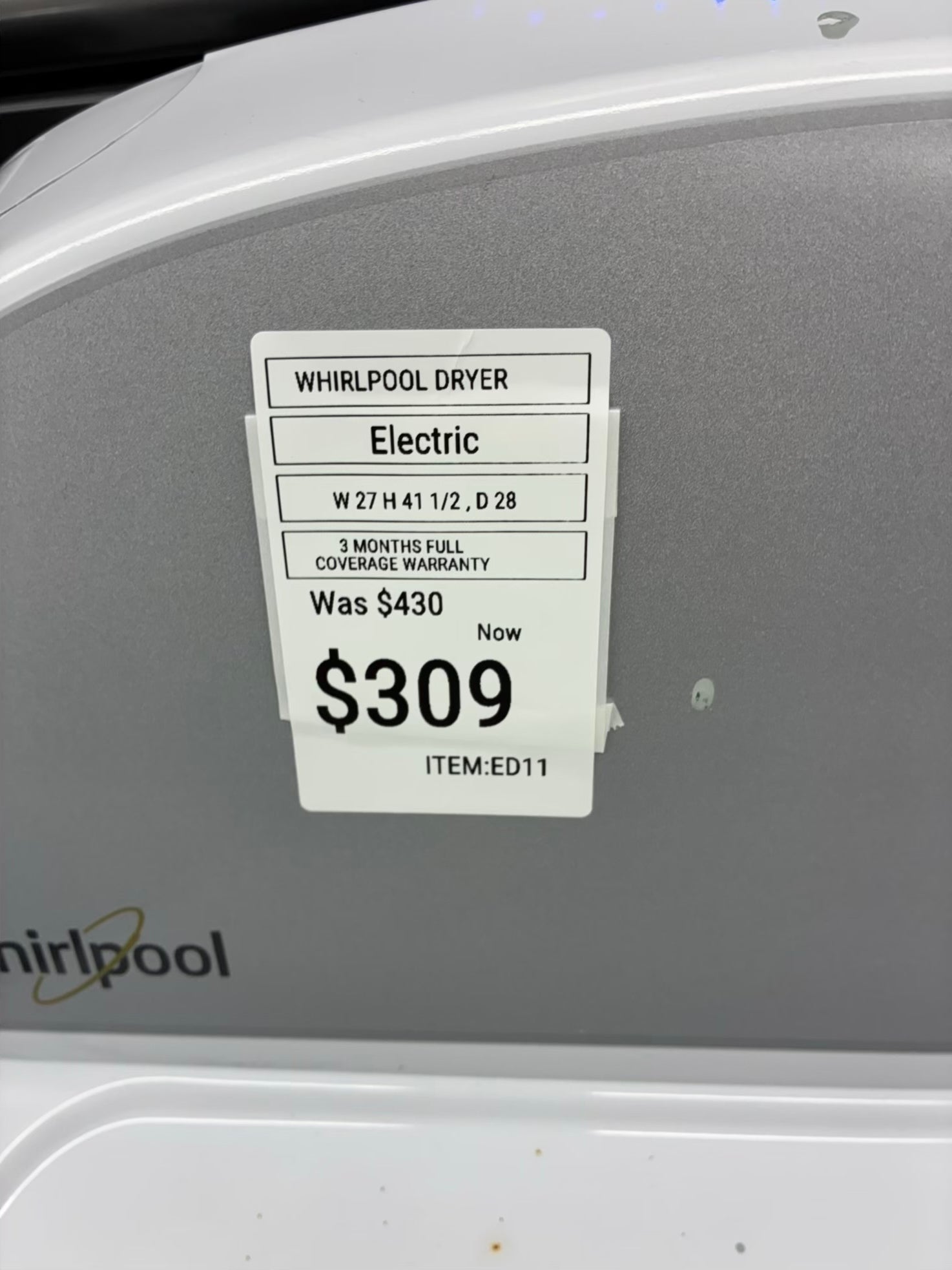 Whirlpool electric dryer 27” large capacity